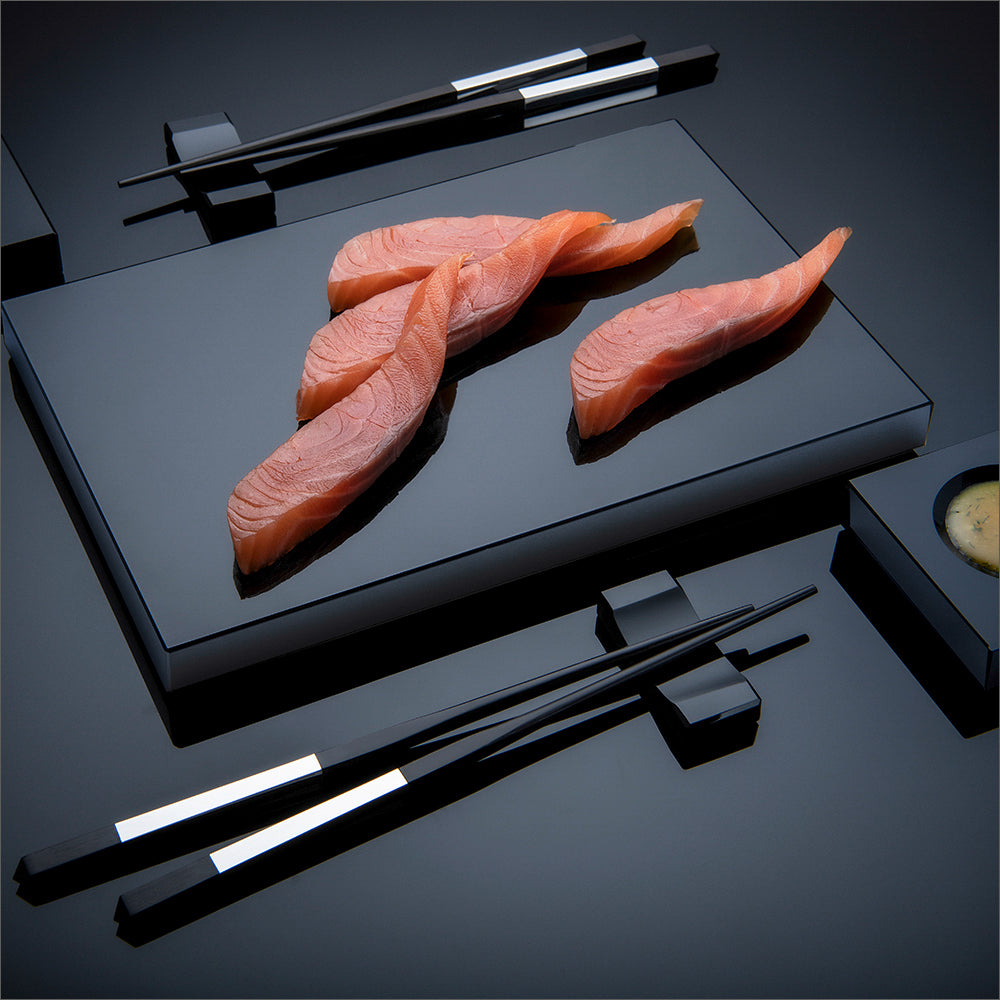 Hochwertiges Sushi-Set, handgefertigt aus Schwarzglas zum Anrichten. Die Oberfläche ist absolut porenfrei, hygienisch glatt und eignet sich deshalb besonders gut als Sushi-Geschirr zum Servieren von rohem Fisch.