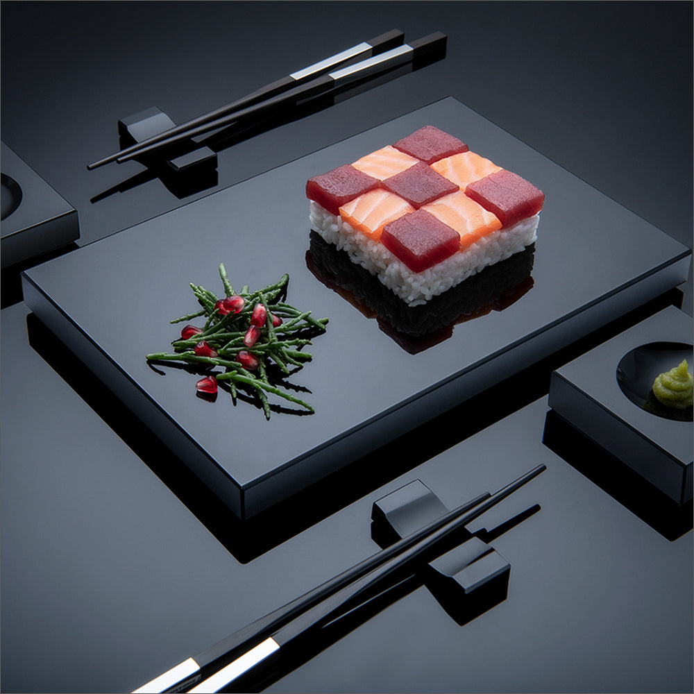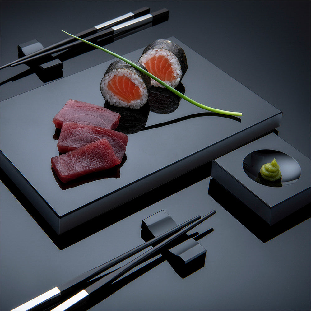 Die tiefschwarze Oberfläche bleibt angenehm kühl und setzt edleSpeisen wie Sushi oder Kaviar stilvoll in Szene.